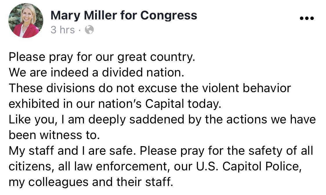 On Wednesday, a violent coup attempt was made on the US Capitol. A coup that was inspired by the sycophantic rhetoric and baseless claims of people who should know better, like Mary Miller, as evidenced above. It's globally embarrassing that lawmakers, who are are trusted with the privilege of representing citizens, would encourage this.